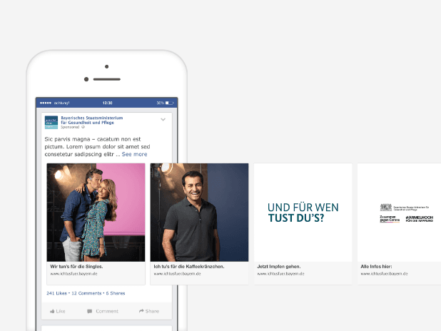 Die Kampagne setzt auf die Solidarität der Menschen untereinander. Prominente als auch unbekannte Menschen nennen in einer Testimonial-Kampagne unter dem Motto „Ich tu´s für …“ ihren ganz persönlichen Grund, weshalb sie sich zur Impfung entschlossen haben. Dabei war die Mischung der Testimonials so bunt und unterschiedlich, wie die Bevölkerung Bayerns selbst.